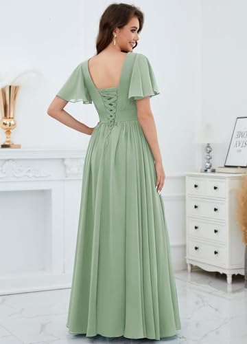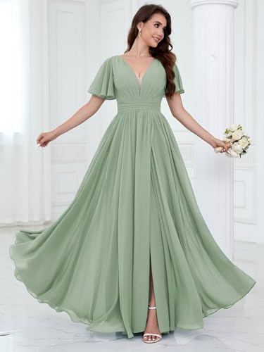 Long Bridesmaid Dresses for Women V Neck A Line Pleated Chiffon Formal Dress with Slit Flutter Sleeve Chiffon Prom Gown