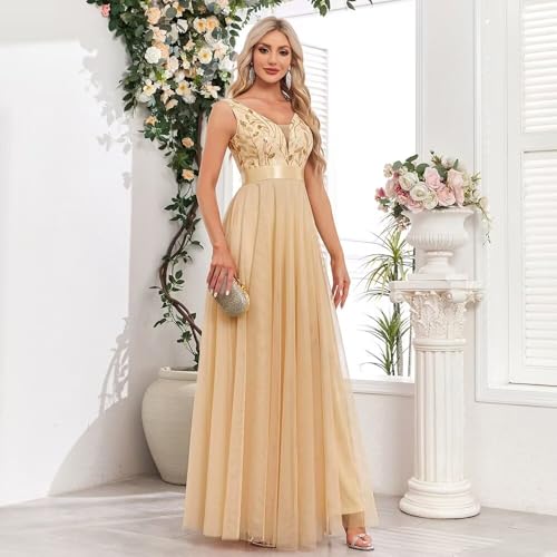 Women’s Formal Dresses Long Tulle Evening Gowns A Line Sleeveless Sparkly Sequin Party Guest Homecoming Dress Gold M